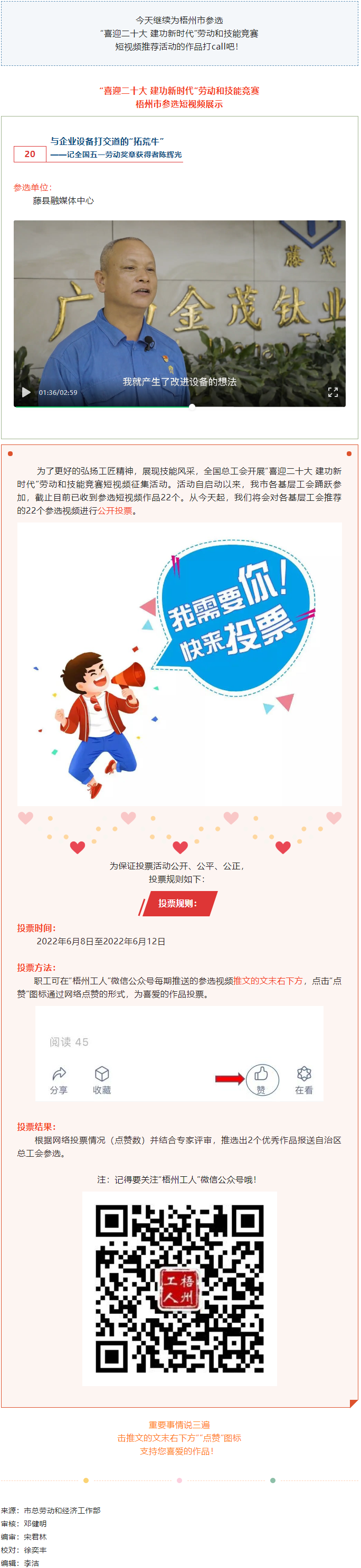藤縣融媒體中心參選作品丨“喜迎二十大 建功新時(shí)代” 勞動(dòng)和技能競(jìng)賽短視頻投票活動(dòng)開始啦!