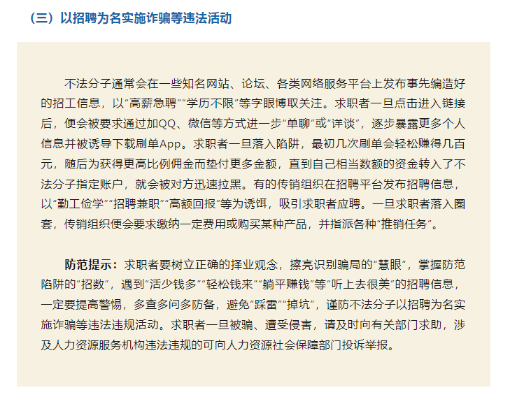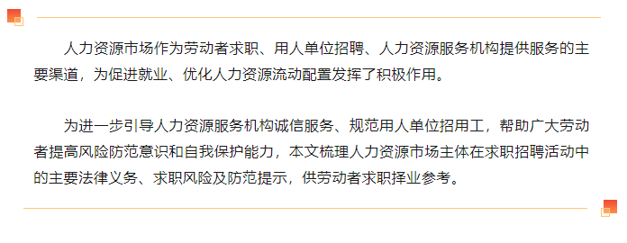 為進(jìn)一步引導(dǎo)人力資源服務(wù)機(jī)構(gòu)誠信服務(wù)、規(guī)范用人單位招用工,幫助廣大勞動(dòng)者提高風(fēng)險(xiǎn)防范意識(shí)和自我保護(hù)能力,本文梳理人力資源市場主體在求職招聘活動(dòng)中的主要法律義務(wù)、求職風(fēng)險(xiǎn)及防范提示,供勞動(dòng)者求職擇業(yè)參考。